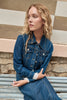 Short denim jacket with long sleeves and buttoned cuffs. Features a belted waist, wide shirt collar, and large flap chest pockets. Finished with a full front button closure, measuring 53cm in a size small.