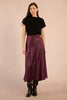 A midi-length satin skirt in dark purple with a high waist and a flared fit, offering a smooth, flowing silhouette with a touch of refined elegance.