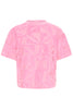 Pink high-neck T-shirt featuring a subtle geometric textured pattern, offering a modern, structured look. Soft, comfortable fabric with a sleek silhouette, perfect for casual wear or layering with contemporary style.